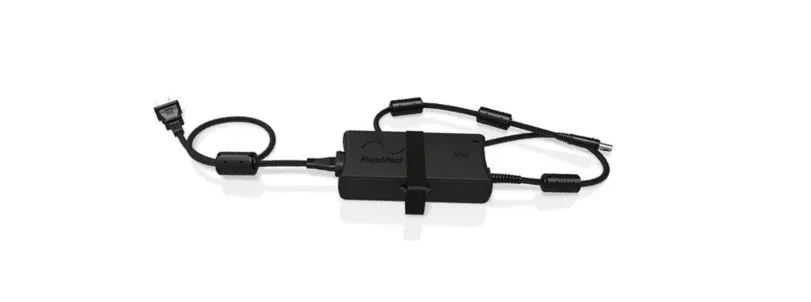 The ResMed AirMini CPAP device, designed specifically for use in travel, requires a special cord with the appropriate adapter as it runs off a 20-watt charge. This power cord is not compatible with the AirSense or AirCurve machines.